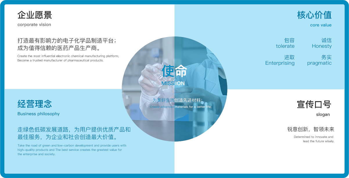 打造最有影響力的電子化學(xué)品制造平臺(tái);成為值得信賴的醫(yī)藥產(chǎn)品生產(chǎn)商